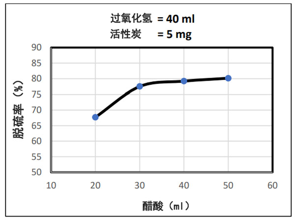 在本研究的最后三個樣本中,有H2O2和活性炭量是固定的,而乙酸的體積卻有所變化。混合物中乙酸含量的增加會導致脫硫百分比的增加,因為發現乙酸具有比其他酸更好的氧化脫硫效果,而且大量的乙酸會導致過乙酸(CH3COOOH)的增加乙酸和(H2O2)之間的反應產生的水量。(CH3COOOH)將與大量的硫化物反應,并將其氧化為砜或亞砜。該研究的結果顯示在圖(3)中。