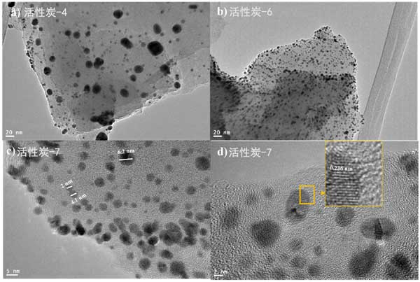 為了進一步研究金顆粒在活性炭表面的分布和結晶度,我們拍攝了鍍金活性炭樣品的透射電子顯微鏡圖像。圖7顯示了各種活性炭樣品在不同放大倍數下的TEM圖像。圖2a、b顯示了金納米粒子在活性炭表面上的分布。很明顯,兩個樣本的分布是均勻的;钚蕴-4和活性炭-6似乎都以類似的方式相互作用和承載金納米粒子。活性炭-7樣品的高分辨率TEM圖像如圖2c、d所示。圖2c顯示大多數金納米顆粒很小,直徑為3-5nm,并且只能看到少數團聚顆粒。圖2d顯示了金的晶格條紋間距。發現晶格條紋間距為0.217nm,對應于金晶面的面。此外,我們試圖通過TEM圖像估計顆粒尺寸的分布,我們發現所有樣品中超過80%的金顆粒的尺寸小于5nm。