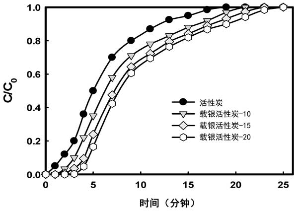 圖3:活性炭和活性炭載銀復合材料的乙醛吸附穿透曲線。
