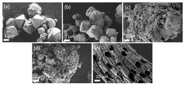 圖1:所選吸附劑的SEM(a)混合沸石、(b)沸石、(c)凝灰巖、(d)活性炭、(e)泥炭。