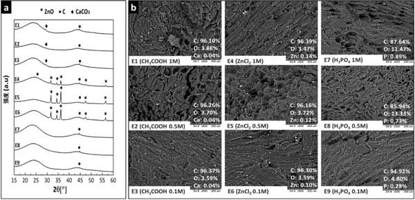 活性炭的X射線衍射圖如圖1-a所示。峰值在2θ=44在所有衍射圖中觀察到的6°歸因于對應于石墨(00-001-0646)的(101)平面。與其他材料不同,活性炭的衍射圖也顯示在2θ=26.4°歸因于石墨(00-001-0646)的(002)平面。ZnO和CaCO3可能是在熱處理過程中作為原材料組分和活化劑之間二次化學反應的產物或由于前體中固有的殘留礦物質含量而產生的。經過掃描電鏡分析500倍的SEM顯微照片如圖1-b所示。觀察到所有活性炭都表現出異質表面形態,其由不規則形式的成組薄片組成。在用ZnCl2活化的碳的表面上觀察到與氧化鋅相對應的沒有特定形狀的白色小顆粒(通過XRPD分析證實)。此外,EDS分析顯示存在分散在整個表面的碳(C)、氧(O)和鋅(Zn),從而證實了ZnO顆粒分散在這些吸附劑的表面上。