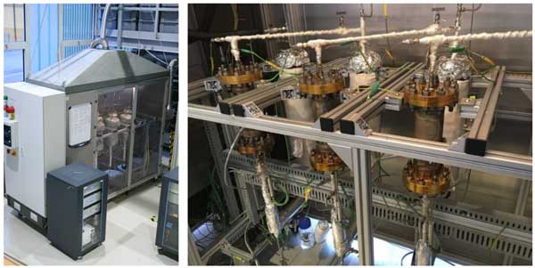 圖1:實驗室規模的甲烷化試驗臺(左),反應器和熱交換器(右)。
