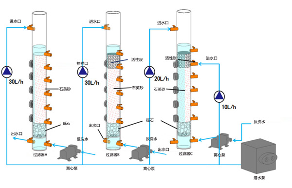 試驗(yàn)裝置如圖1所示,主體結(jié)構(gòu)采用有機(jī)玻璃制成,內(nèi)徑70mm,高度2000mm。過(guò)濾器包括進(jìn)水管、出水管、反沖洗水管、支撐層和過(guò)濾介質(zhì)層。200毫米高的支撐層由礫石制成。粒徑為0.5-1mm,和分別為1-2mm,過(guò)濾層的填料為石英砂和椰殼活性炭。過(guò)濾器A的填料層為1000mm石英砂。過(guò)濾器B、C的填料層均為上層200mm椰殼活性炭和下層800mm石英砂。根據(jù)水廠的設(shè)計(jì)規(guī)范,過(guò)濾器的過(guò)濾速度為8m/h,進(jìn)水流量為30L/h。過(guò)濾器A和B為單點(diǎn)進(jìn)水,過(guò)濾器C為兩點(diǎn)進(jìn)水,兩個(gè)進(jìn)水點(diǎn)分別位于過(guò)濾器頂部和20cm深度處;第一進(jìn)水點(diǎn)流量為20L/h,第二進(jìn)水點(diǎn)流量為10L/h。過(guò)濾器A和B是過(guò)濾器C的空白對(duì)照。過(guò)濾器每24小時(shí)反洗一次。