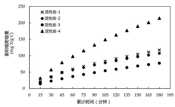 活性炭是去除有機物的常用吸附劑。吸附性能主要取決于其比表面積和微孔結構。它們具有較高的內部孔隙率,因此具有較高的吸附性。在本研究中,對四種具有不同表面性質的顆粒活性炭樣品(活性炭-1、2、3和4)進行了去除黃藥的測試。將兩克活性炭樣品與50毫升1590毫克/升的黃藥溶液混合15分鐘。過濾活性炭,并用紫外-可見光譜法測量溶液中的殘余黃藥。通過重復使用碳樣品,重復該程序12次,以達到大吸附量。如圖1所示,活性炭-4的吸附容量比較高,因此選擇其進行進一步研究。