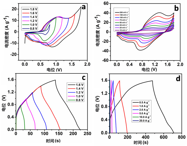 超級電容器裝置的制造是集成陰極(氧化鎳),陽極(活性炭)使用纖維素濾紙(在2.0M/KOH電解液中浸泡放置)分離,然后用絕緣膠帶包裹。陽極和陰極具有相似的幾何表面積,再經過合適的重量比來制成電容器。圖2a顯示了超級電容器件在各種截止區域中的CV曲線,掃描速率為50mVs-1。從圖中可以看出,電容器件的CV曲線呈現出典型的準矩形電容性能,這對應于雙電層電容器和贗電容的相互貢獻。此外,當增加工作截止區時,會發生更多的法拉第電化學反應。當工作電位超過1.7V時,也會在CV曲線上注意到氧氣的釋放。活性炭/氧化鎳器件很大程度上取決于截止區域。因此,選擇1.6V作為隨后研究超級電容器件電化學性能的潛在窗口區域。圖2b顯示了活性炭電容器件在0到1.6V的截止區域內的各種掃描速率下的CV曲線。電流密度隨著掃描速率的增加而增加,并且氧化峰電位轉移到更正的電位,類似三電極器件的結果。
