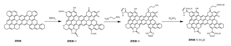 以活性炭為原料,用HNO3氧化,用乙二胺胺化。得到的中間體用硫酸水溶液處理以產生硫酸氫活性炭催化劑。通過過濾分離產物并在105℃干燥24小時。活性炭的具體制備方案如圖1所示。