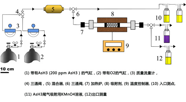 實驗裝置的方案在圖1提供。將氣流以200mL/分鐘的氣體流速引入混合器中。該氣體由稀釋在O2(0-1.2%)中的AsH3(200ppm)組成。然后預混合氣體進入填充有0.2g活性炭吸附柱的固定床。設置兩個采樣口:一個用于進口氣體,一個用于出口處理后的殘余尾氣。廢氣經酸性KMnO4處理。在這項研究中,AsH3去除效率和吸附容量用于評估活性炭的砷吸附能力。所有實驗重復3次,計算標準差和平均值。