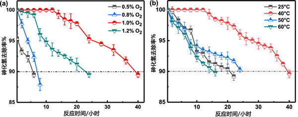 圖2:氧含量(a)和反應溫度(b)對AsH3去除效率的影響。