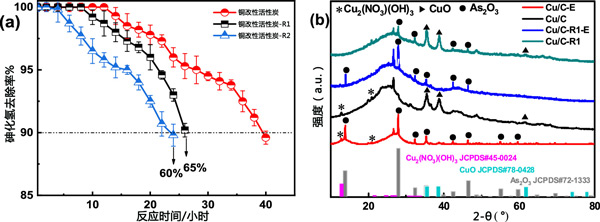 銅改性活性炭通過水洗和吹掃氣體法進行再生。為此,活性炭樣品首先在100℃的熱空氣中活化3小時。然后用去離子水浸泡清洗4-5次,放入電熱風烘箱中110-120℃烘干。之后,將樣品置于氮氣氣氛下的管式爐中,并使用程序升溫控制器升高溫度。考慮到通過在180℃下烘烤獲得的材料,溫度首先設定在20-180℃。之后,停止加熱,將樣品冷卻至室溫。取出樣品,停止氮氣流,對再生材料進行測試。如圖3a所示,R的再生效率(R為再生吸附劑與新鮮吸附劑的穿透時間之比)在一個再生循環后為65%。在第二次再生循環后,樣品恢復效率R達到60%,證實了活性炭吸附劑對去除AsH3具有合理的再生能力。為了確定活性炭吸附劑再生后表面相的變化,通過XRD分析活性炭吸附劑。如圖3b所示,再生后活性炭-R1中35.6°、38.8°和61.8°的CuO衍射峰強度明顯增加,但沒有Cu2(NO3)峰被找到。這表明在再生過程中回收的一些CuO物種可能被中間體Cu2(NO3)(OH)3轉化。此外,活性炭-R1樣品中As2O3在28.0°、32.2°、35.5°、42.6°、46.4°、55.0°和59.6°處的結晶峰明顯減弱。推測中間體Cu2(NO3)(OH)3向吸附活性中心CuO的轉變和結晶As2O3的分離可能是活性炭吸附劑再生性能好的原因。