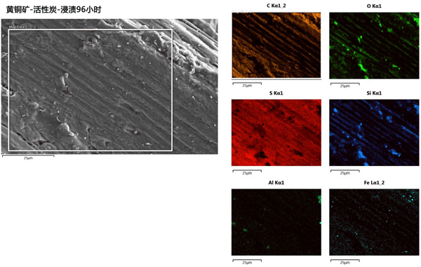 選擇在48和96小時浸出后獲得的固體樣品進行后續表征。由于硫化物硫氧化成元素硫,形成的新物質是硫。需要注意的是,添加活性炭和未添加碳的浸出殘渣中的硫含活性炭催化劑從硫化銅中浸出金屬量存在很大差異。浸出殘渣黃銅礦在96小時的SEM-EDS顯微照片顯示硫吸附在活性炭的表面(圖2)。這種現象可以在活性炭催化的黃銅礦浸出機理中發揮重要作用,抑制其表面硫鈍化層的形成,從而提高該過程的動力學。碳材料對元素硫的吸附可以簡化從浸出渣中去除硫的過程,從而減少最終礦山廢物對環境的影響。