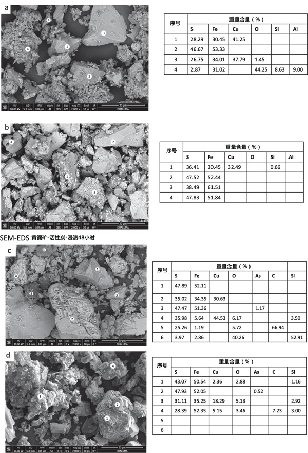 在浸出殘渣中發現的其他礦物種類是黃銅礦、黃鐵礦、閃鋅礦和石英。氧化還原電位必須足夠低才能形成Cu2S,而黃鉀鐵礬沉淀在非常高的氧化還原電位下更受青睞。通過SEM-EDS對初始活性炭樣品(圖3a)和浸出殘留物(圖3b和3c)的分析表明存在黃銅礦、黃鐵礦和初始精礦中的小石英顆粒。浸出48小時后(圖3b),固體殘留物顯示存在黃銅礦,表面因浸出而改變黃鐵礦。對活性炭浸出48小時后獲得的殘留物的分析表明存在黃鐵礦、吸附硫的碳,并且一些黃銅礦顆粒發生了很大的變化,表明從黃銅礦中優先浸出Fe而不是Cu。