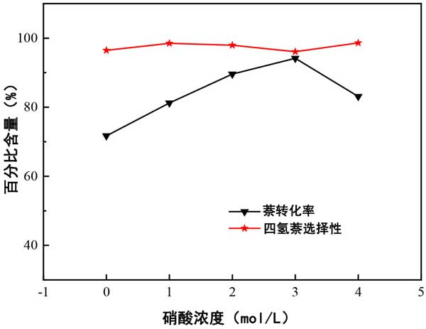 圖2:改性劑濃度對萘轉化率和四氫化萘選擇性的影響。
