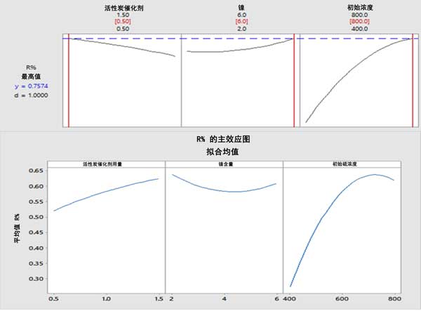 圖2:研究變量對二苯并噻吩轉(zhuǎn)化率的影響,轉(zhuǎn)化率隨著活性炭催化劑用量和初始硫濃度的增加而增加,隨著Ni負(fù)載量的增加而降低(上圖)。對于活性炭催化劑用量、Ni負(fù)載量和初始硫濃度,在0.5g、6%和700ppm時,最佳二苯并噻吩轉(zhuǎn)化率分別為75.74%(下圖)。