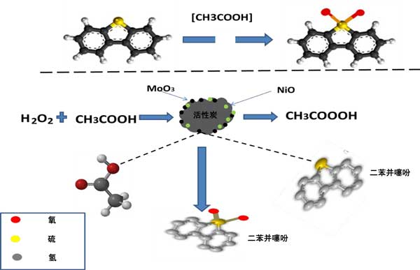 圖3:NiO-MoO3活性炭催化劑存在下H2O2/CH3COOH氧化體系對二苯并噻吩的氧化脫硫機(jī)理。