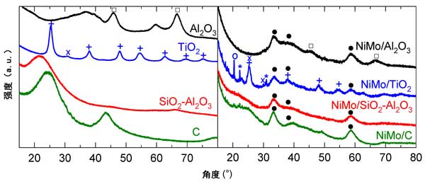 本工作的目的是研究HDO/HDS催化劑失活的第一種方法,即載體的結構和質地變化。選擇高表面積和介孔的Al2O3、TiO2、SiO2-Al2O3載體來沉積NiMo硫化物,用于辛酸加氫脫氧和1-苯并噻吩HDS在1.6MPa和330℃下的平行反應。中孔的高表面積應該能夠分散NiMo相的高負載量。這些中孔載體的薄壁應該對H2O和/或酸性CO2/H2的破壞更敏感催化劑前體和HDO/HDS還原硫化過程中的O混合物。由于其惰性和高HDO/HDS活性,已選擇活性炭進行比較。因此,我們分別使用XRD和氮氣物理吸附闡明了HDO/HDS后載體、硫化物催化劑和硫化物催化劑的結構和質地特性。