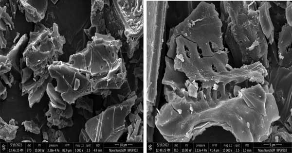 使用掃描電子顯微鏡分析獲得的活性炭的孔結(jié)構(gòu)。SEM設(shè)備具有超高分辨率低電壓成像和獨(dú)特的低真空能力。SEM圖像是在15kV時(shí)以1nm、1kV時(shí)1.4nm、3kV時(shí)1.8nm和30Pa的不同分辨率拍攝的。觀察活性炭的表面物理形態(tài)是通過(guò)使用SEM完成的技術(shù)。圖3顯示活性炭的SEM圖像。這表明活性炭的外表面具有均勻開(kāi)放的大孔。此外,活性炭的表面是高度多孔的,其特點(diǎn)是不均勻。同樣清楚的是,活性炭在其外表面具有微孔和空腔,暗區(qū)位于該處。經(jīng)受碳化后,活性炭由于ZnCl2的蒸發(fā)而產(chǎn)生空隙(稱(chēng)為氣孔)。可以將這些孔視為通向微孔網(wǎng)絡(luò)的通道。