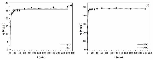 研究了初始吸附物濃度為50mgL-1和pH4的兩種活性炭的亮藍染料染料吸附動力學行為。作為時間函數的吸附容量曲線分別如圖3a、b所示,分別為活性炭1和2。可以觀察到活性炭2獲得的曲線的特征在于更快的吸附速率。活性炭2在大約10分鐘內達到平衡。對于活性炭1,在大約60分鐘內達到平衡。由于活性炭1呈現的較高總孔體積,可以解釋這種行為。高孔體積可以通過允許染料分子在孔內更快地擴散到吸附位點來增強吸附動力學。