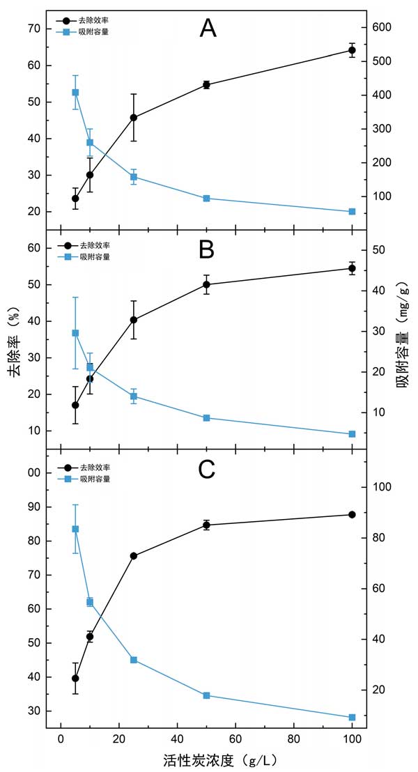 圖1:用幾種濃度的活性炭處理農用工業沼渣時,計算的COD(A)、PO4-P(B)和總酚(C)參數的吸附容量和去除效率。