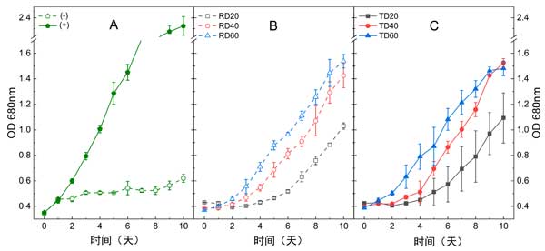 厭氧消化物中存在的大量和微量營養素的多樣性可能有利于藍藻代謝。即使活性炭預處理顯著降低了幾個參數,包括COD、濁度和苯酚含量,原料(4405mg/L)和預處理消化物(4220mg/L)的銨濃度仍然高于藍藻螺旋藻支持的閾值濃度(100–150毫克/升)。在這種情況下,使用以三種不同稀釋率稀釋的原始和預處理消化物進行了一系列藍藻毒性測定:20×、40×和60×。未稀釋的消化物,無論是否用活性炭處理,都沒有在本實驗中進行測試,因為初步培養分析表明它們對培養物毒性太大(數據未顯示)。因此,該實驗的目的是比較以不同稀釋率稀釋的兩種消化物以及兩個對照組之間的生長性能。連續測量680nm處的OD超過10天,以評估所有條件下的生長情況。在三種不同稀釋因子下測試的原始消化物(RD)和處理過的消化物(TD)條件下,觀察到類似生長趨勢(圖2A、B)。當增加原始和預處理消化物的培養基稀釋倍數時,會產生更高的生長反應。同樣,滯后期受原始消化物和預處理消化物的稀釋因子的影響,觀察到的滯后期越長,消化物越濃縮。例如,稀釋20倍和40倍的未處理消化物的滯后期分別持續4天和2天。在本研究中,根據稀釋倍數和預處理條件,使用221和71mg/L之間的初始銨氮(NH4+-N)濃度,鈍頂藻能夠增殖。一般而言,原始消化物和預處理消化物的更高稀釋度產生更高的生長。