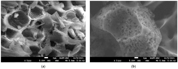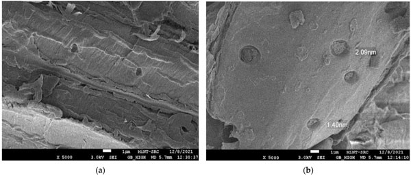 使用FESEM分析觀察了活性炭產品的浸漬和碳化溫度影響的形態變化。圖1a、b描繪了木質素在被激活之前的表面形態。它顯示出厚而平坦的圖案,中間有小裂縫。這歸因于大量的木質素,一種酚類聚合物,賦予植物結構強度,使其具有堅硬粗糙的木材狀結構。在圖1b中,發現前體具有壓實的表面,上面有淺而堵塞的孔隙圖案。這可能是由于烘箱干燥過程中預處理和加熱過程的反應。從圖1a、b,由于無孔表面的存在,表面清楚地顯示為不令人滿意的吸附材料。