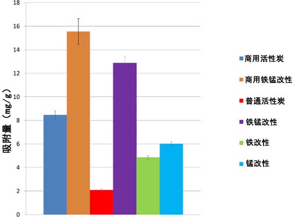 為了比較各種活性炭吸附砷(V)的效果,將0.1克活性炭添加到50mL/50ppm砷(V)樣品中。將樣品以150rpm攪拌6小時,然后過濾,然后對濾液進行元素分析。為了比較不同活性炭基質的功效,以每克活性炭吸附的砷(V)毫克數(mg/g)來比較相對于添加的活性炭量的吸附。如圖所示數字圖1,與鐵、錳和鐵/錳一起官能化后,砷的吸附有顯著改善。