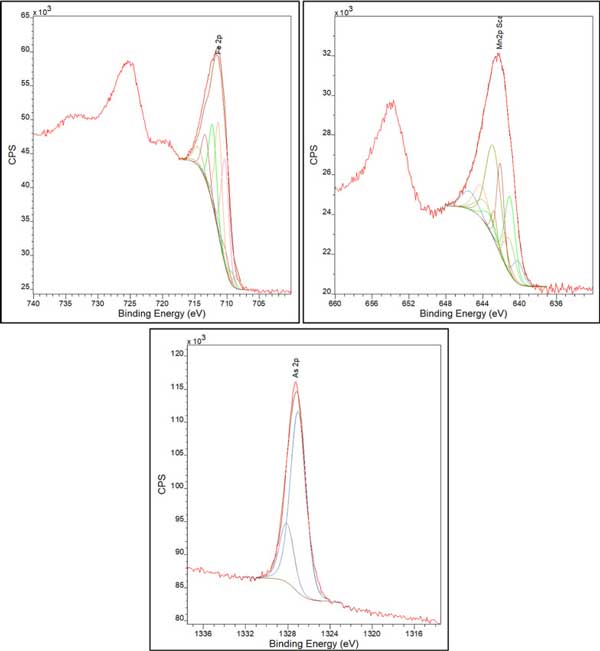 圖2:負載FeMn的活性炭、As曝光后的Fe(左上)、Mn(右上)和As(底部)XPS峰的解卷積。