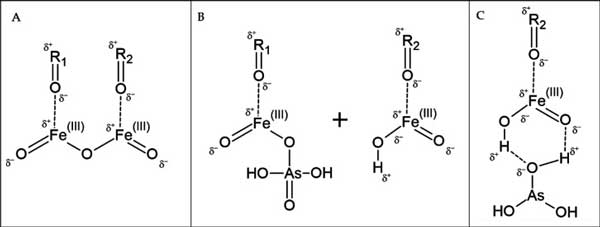 圖3:(A)顯示物理吸附到活性炭表面的鐵。(B)顯示了由于暴露于砷而形成的兩種鐵產物FeOOH和中間體FeO–O–AsH2O3。(C)顯示了還原的As(III),這是電子從活性炭流過鐵的結果,通過氫鍵物理吸附到載鐵表面。