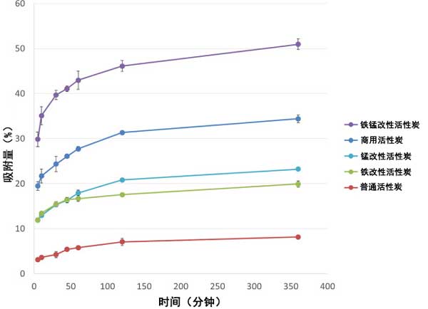 砷(V)動力學曲線使用負載金屬的活性炭、標準活性炭和商業活性炭對砷(V)的吸附動力學進行了評估,結果顯示在圖5。對于每種碳材料,砷(V)的吸附在6小時后達到平衡。標準活性炭顯示出最低的吸附容量,6小時后達到總可能吸附量的8.13±0.16%。負載鐵的活性炭和負載錳的活性炭均表現出比標準活性炭更高的吸附容量,表明表面的金屬負載確實提高了活性炭的吸附容量。負載鐵和負載錳的活性炭在短攪拌時間和長攪拌時間下對砷的吸附均比標準活性炭有顯著改善,6小時后分別達到19.90±0.71和23.21±0.23%。