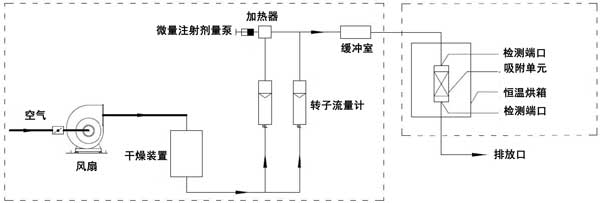 動態吸附實驗在室溫(25℃)下進行。實驗裝置由氣體分配系統和吸附系統兩部分組成。吸附系統由恒溫箱和吸附單元組成。檢測口位于吸附系統之前和之后。動態法測定活性炭對脈沖負荷緩沖性能的裝置如圖1所示。本實驗以乙醇或二甲苯為單一檢測對象。氣體分配系統包括風扇、干燥裝置、轉子流量計、微注射計量泵、加熱器和緩沖室。使用FT-IR傅里葉氣體分析儀作為測量設備。在氣體分配系統中,在短時間內(2分鐘和5分鐘),微注射計量泵的注射量迅速增加到原始體積的預定倍數(10倍和20倍),以產生脈沖負載。在吸附系統中,吸附單元內放置活性炭。吸附單元的直徑為31mm;钚蕴康奶畛涓叨确謩e為2cm、4cm、6cm、8cm。將吸附裝置置于恒溫箱內。吸附劑和吸附物的入口空氣保持在室溫。進行了吸附劑在室溫下吸附吸附質的脈沖加載實驗。潔凈空氣通過干燥裝置后,利用轉子流量計將其按特定比例分成兩個通道。通過微注射泵將特定濃度的乙醇或二甲苯氣體注射到氣體中。另一種氣體用作稀釋氣體。兩種氣體流入緩沖室,完全混合后進入恒溫箱。穩定的氣體按照實驗設定的濃度、流量和溫度進入吸附單元。在通過吸附單元之前和之后測量乙醇或二甲苯的濃度。