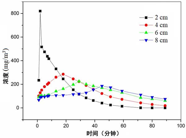 乙醇作為吸附物。截面風速設定為0.3m/s。飽和吸附濃度為200mg/m3。脈沖時間為2分鐘。脈沖倍數為20倍。通氣方式為正壓通氣。不同高度出口濃度隨時間變化曲線如圖4所示。