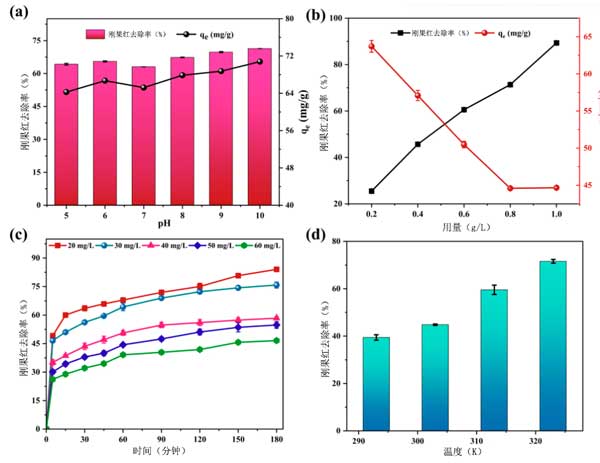圖2:吸附參數包括(a)pH值的影響,(b)劑量的作用,初始剛果紅濃度的影響,以及(d)溫度對剛果紅在活性炭上吸附的影響。