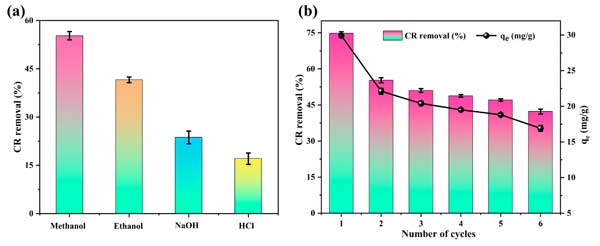 在圖4a中描述的解吸實驗證明了溶劑類型對從支出的活性炭中去除CR的顯著影響。溶劑按降低的解吸效率順序為甲醇>乙醇>NaOH>HCl,其去除效率分別為55.28%,41.56%,23.66%和17.06%。與乙醇相比,甲醇的出色性能是由于其較低的分子量和較短的烴鏈。這些特性可能有助于更有效地滲透到活性炭的孔中,從而破壞CR-活性炭相互作用。此外,其較高的極性大概有助于破壞非共價相互作用,例如氫鍵或范德華力。相反,對NaOH和HCl觀察到的較低的解吸效率表明,強堿或酸不容易逆轉CR-活性炭的吸附。這可能是由于較大離子物種的孔穿透有限,可能受到空間效應或擴散屏障的阻礙,或者是由于與Cr反應后保留在孔中保留的不溶性沉淀物的形成。因此,選擇甲醇作為再生研究的解劑溶劑。