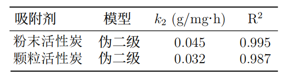 吸附過程符合偽二級動力學模型(R2>0.99),表明化學吸附為主導機制。吸附速率常數k2隨粒徑減小而增加,反映了粉末活性炭的快速吸附特性(圖2)。