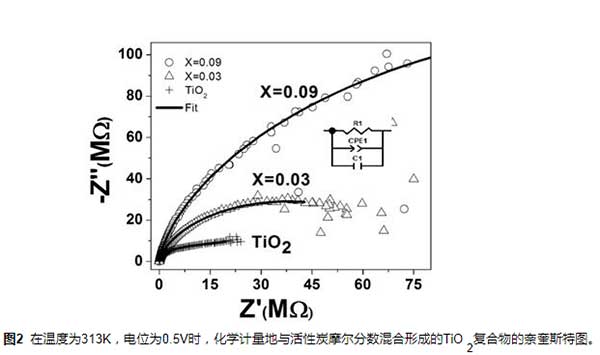 表1化學計量學與活性炭摩爾分數混合的TiO2的等效電路的參數值,在313K的溫度下獲得。