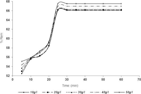 用于吸附除去SDP的相對于時間和吸附劑劑量的結果示于圖2,3在10-50克/升的范圍內。圖 5和6表明,SDP去除與在吸附劑用量增加而增加。從圖中可以看出,對于活性炭1(圖2)和活性炭2(圖 3),平衡時間為30分鐘后,顆粒截留迅速增加并趨于恒定 。從圖 5中,活性炭1在10g / l時的去除百分數分別為5和30-60分鐘時的60.5978和69.8369%。對于活性炭1(圖 2),分別以50g / l,63.3152和74.1168%記錄5分鐘和(30-60)分鐘。在圖3(活性炭2)中描繪了類似的趨勢, 其中在10g / l劑量下分別在5分鐘和(30-60分鐘)達到52.4456和66.1005%。對于50g / l 活性炭2劑量,分別在2和(30-60)分鐘時達到55.095和67.527%的去除率。結果表明,活性炭1在本實驗條件下表現優于活性炭2。