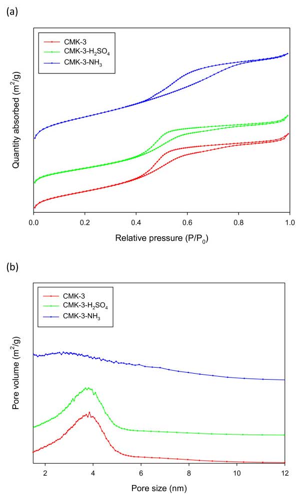表1列出了本研究中使用的活性炭的物理性質。活性炭-3的比表面積為1178m 2 / g。經硫酸處理后比表面積略有下降至1,002m 2 / g,經氨處理后比表面積大幅度上升至1663m 2 / g。圖2示出了氮氣吸附等溫線和孔碳的孔隙大小分布。圖2a示出了用于活性炭-3,活性炭-3-H的氮吸附等溫線2 SO 4,和活性炭-3-NH 3。所有樣品在0.5 的相對壓力(P / P 0)下都顯示典型的介孔材料的IV型等溫線。表表11表明,CMK-3具有的3.8納米的孔徑中孔。用硫酸處理后維持這些中孔。當活性炭-3用氨處理時,平均孔徑減小到3.1nm。氨處理是高溫(900℃)工藝,其產生微孔,引起表面積的大量增加和平均孔徑的減小。另一方面,大部分介孔活性炭-3在氨處理后保持。