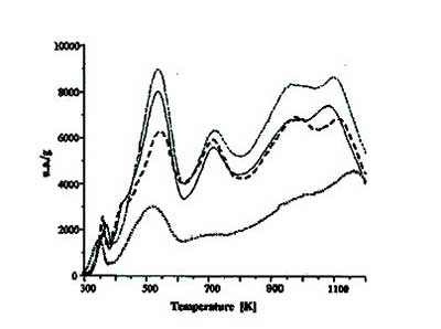 分析表明25℃下的反應(yīng)只產(chǎn)生很小的變化,所以在低溫下HNO 3溶液主要以酸的形式反應(yīng),只對活性炭產(chǎn)生微小的改變。然而,在80℃下的活性炭反應(yīng)顯示與HNO 3的氧化作用有關(guān)的主要變化,如活性炭中總表面基團(tuán)的總體增加和羧基類似基團(tuán)的最大形成。另外,由樣品的堿度降低可以解釋為6M硝酸溶液處理3小時(shí)后堿性基團(tuán)的延長氧化的結(jié)果。圖2顯示了這些活性炭的TPD曲線,觀察到新峰的存在,給出了碳的化學(xué)組成的變化,即氧化基團(tuán)的增量。硝酸改性碳的元素分析表明,由其他人觀察到,增加氮含量可以歸因于硝基(NO 2)形成的影響。