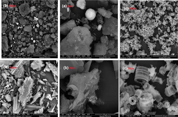 圖2:商業活性炭(a)活性炭(b)普通活性炭(c)在100和20μm放大倍率下的顯微照片。