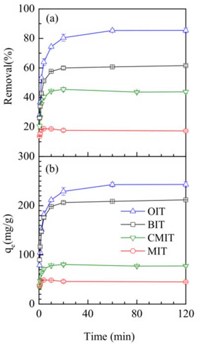 圖1.吸附時間對去除異噻唑酮(a)和吸附量(b)在活性炭劑量為100mg·L-1時在溫度25℃的影響。