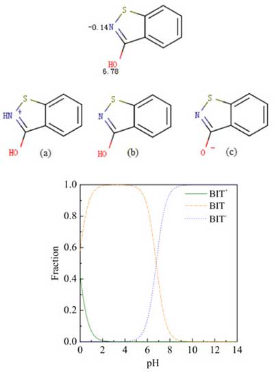 圖2顯示了根據它的pKa在不同pH條件下BIT的狀態。BIT的狀態是(b)在pH2-6,這是非離子和疏水的,導致高吸附。當pH為7-12時,BIT保持負電荷,這意味著它與水具有緊密的親和性并且被活性炭吸附不良。當pH<4時,OIT已經收取官能團,這影響了吸附。在pH>pH pzc時,帶負電的氧官能團也阻礙OIT在活性炭上的吸附。官能團也影響活性炭的吸附。