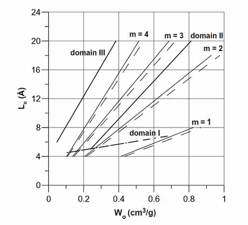 活性炭孔隙率遵循三個線性結構域所示的常見趨勢。這一事實表明存在著由不同前體和精制路線的固體部分共同形成的共同形態。根據這些多孔固體的近期和各種已發表的特征,它們的孔壁由基本結構單元的空間排列構成,所述基本結構單元由層疊的石墨烯層組成。為了減少模型中的參數數量,結構被描述為圓盤狀顆粒,其直徑的特征在于石墨烯層中涉及的苯環的數量,并且其厚度由堆疊層的數量和層間距離。用于工業宏觀尺寸盤狀顆粒堆積的可用經驗相關性已經應用于那些納米級結構,導致在chars和碳分子篩觀察到的實驗微孔體積范圍內的值。
