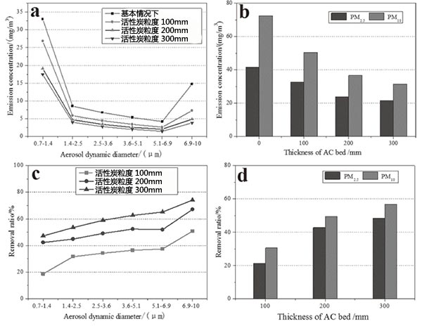 (1)活性炭去除PM 10比去除PM 2.5更有效,并且增加活性炭的吸附厚度或減小活性炭粒度有助于去除超細顆粒。除去率到PM 10和PM 2.5達到67.3%,并且當活性炭厚度和顆粒尺寸分別為200mm至3-5毫米,吸附效果能達到58.7%。
