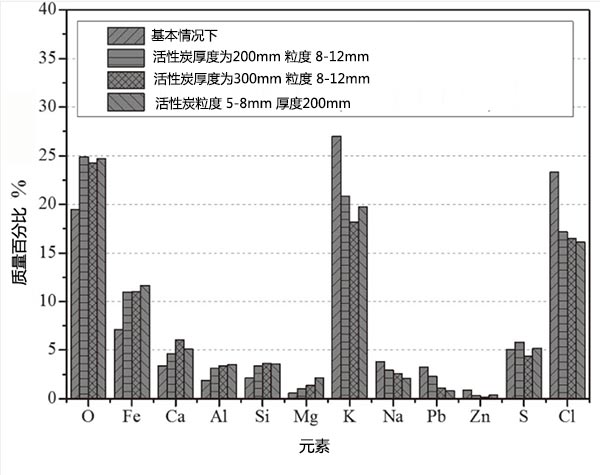 圖4顯示了煙氣通過活性炭之前和之后的化學組成。可以發(fā)現(xiàn)PM 2.5中的+ Fe,Ca,Si,Al和Mg的含量在煙氣通過活性床時比基礎(chǔ)情況下都有所增加,而K,Na,Pb的含量, PM 2.5中的 Zn和Cl都出現(xiàn)了下降。圖5給出了煙氣經(jīng)過活性炭層后在過濾器中收集的PM 2.5的SEM圖像,觀察到經(jīng)活性炭去除后,較大顆粒的數(shù)量主要由K和Cl組成減少(圖5)(b)-5(d))與基本情況比較(圖5(a))雖然有許多較小的顆粒,如球形顆粒(圖5(d)),主要包含F(xiàn)e和Ca這種現(xiàn)象與PM 2.5的化學成分變化非常一致。此外,與使用厚度為200毫米,粒度為8-12毫米的活性炭床的情況相比(圖5(b)),出現(xiàn)了較少的大的富含K-Cl的顆粒,并且出現(xiàn)了許多較小的球形富含F(xiàn)e-Ca的顆粒。