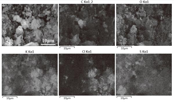 圖5顯示了粘附顆粒物質(zhì)后活性炭的形態(tài),其中可以發(fā)現(xiàn)許多顆粒分布在活性炭的孔隙或表面上。圖5(a)-5(c)中示出了分布在孔隙尺寸約20顆粒 μ米,5-10 μm和1 μ米。圖5(d)示出了分布式活性炭的表面上的顆粒,其直徑幾乎小于1 μ微米。圖6給出了分布在孔隙中的顆粒的SEM映射,表明大量顆粒富含K,并且它們主要以氯化物或硫酸鹽的形式存在。這些顆粒的出現(xiàn)對應(yīng)于PM 2.5中K和Cl含量的降低。