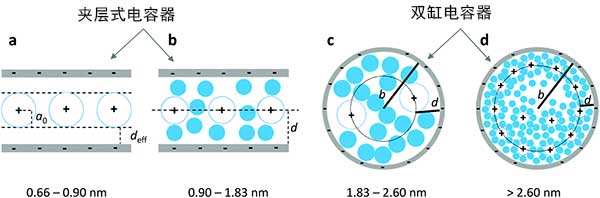 (1)對(duì)于亞納米孔(<2nm)的恒定電容的假設(shè)與許多觀察結(jié)果相矛盾并且過于簡(jiǎn)單化。已經(jīng)在許多場(chǎng)合觀察到電解質(zhì)離子在1nm以下的孔中的限制作用。