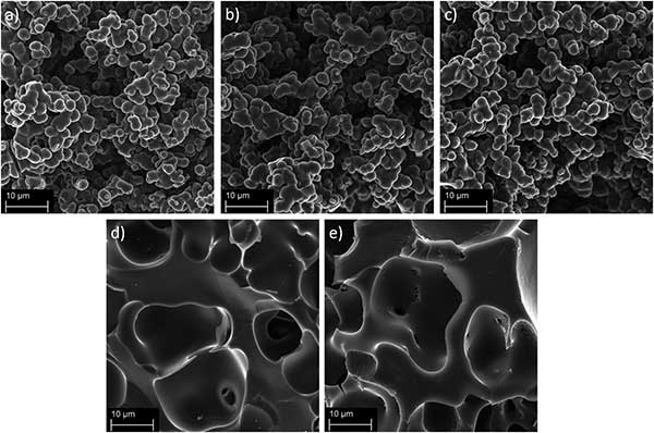 通過掃描電子顯微鏡對(duì)高比表面積活性炭進(jìn)行表征于圖2a-c中。可以看出的是這幾種活性炭具有它是由球形碳顆粒的尺寸與周圍3μm的孔隙網(wǎng)絡(luò)結(jié)構(gòu),這是典型的基于甲醛樹脂活性炭。球形活性炭納米顆粒的燒結(jié)導(dǎo)致孔隙網(wǎng)絡(luò)內(nèi)的空腔,其在直徑為2至20μm的形成。活性炭表面是光滑的,沒有燒結(jié)的球形活性炭納米顆粒,而它們?nèi)匀辉诰W(wǎng)絡(luò)內(nèi)具有相似直徑的空腔。由于在化學(xué)活化之前低的預(yù)碳化溫度,球形納米顆粒在活化過程中強(qiáng)烈聚集,這導(dǎo)致如前所述的較不剛性的孔隙網(wǎng)絡(luò)。