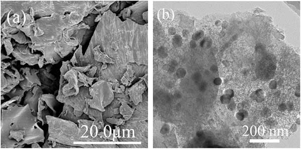 圖1:活性炭(a)的掃描電子顯微鏡形態和納米零價鐵負載活性炭的透射電子顯微鏡圖像(b)。