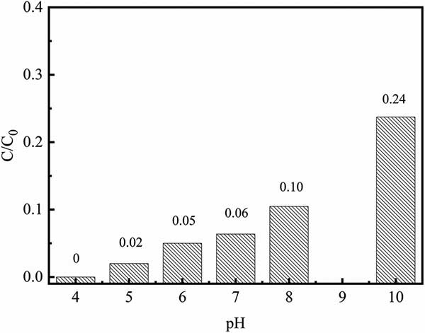 初始pH對鉻酸鹽去除能力的影響如圖3所示。發現鉻酸鹽的去除能力明顯受pH值在4.0-10.0范圍內的影響。隨著溶液pH從4增加到10,鉻酸鹽去除率從100%下降到76%。在pH~4.0時,HCrO 4是鉻酸鹽的主要形式。因此,在高溶液的pH值,使Cr之間的強烈競爭羥基(OH)應該是低鉻酸鹽去除能力的主要原因。此外,較低的pH可有助于去除無源氧化鐵層,活性炭復合材料的表面中含有納米零價鐵用于接觸周圍的Cr(vi)溶液。因此,在所有后續的程序將Cr溶液的初始pH設定為4.0。