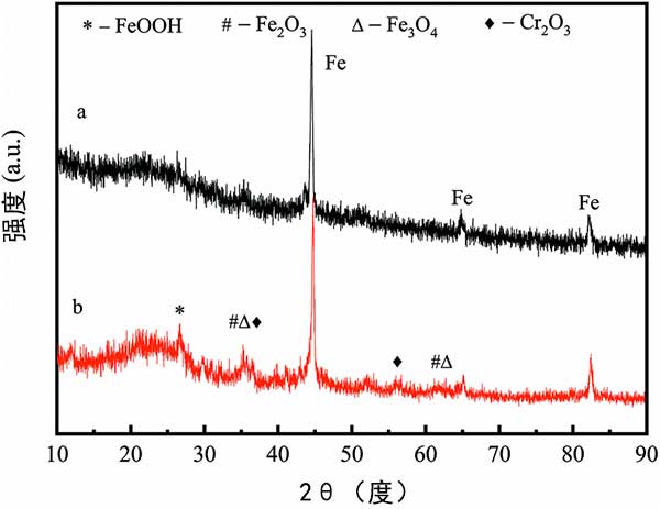 在該研究中,應用XRD分析鉻酸鹽溶液處理后的活性炭以揭示其機制。在與鉻酸鹽溶液反應2小時后,活性炭的XRD圖譜沒有顯著改變(圖4)。然而,與新制備的活性炭相比,可以清楚地檢測到氧化鐵晶相。XRD結果表明,而在去除鉻酸鹽期間,活性炭搭載的納米零價鐵可以被氧化成Fe(ii)和Fe(iii)化合物。
