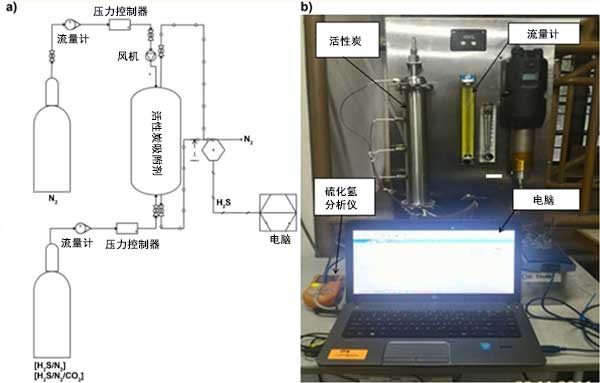 在設計為0.3米長的實驗室規模的單吸附塔單元中檢查六種活性炭對硫化氫的吸附性能。每種活性炭的高度指的是不同的活性炭載荷,分別為0.032kg,0.105kg和0.155kg。通過單次進料H 2 S/N 2(1000 ppm H 2 S余量N 2)或H 2 S/N 2/CO 2(1000 ppm H 2)的混合氣體觀察吸附性能。圖1(A)和圖1(B)分別顯示了硫化氫吸附系統的示意圖和實際照片。